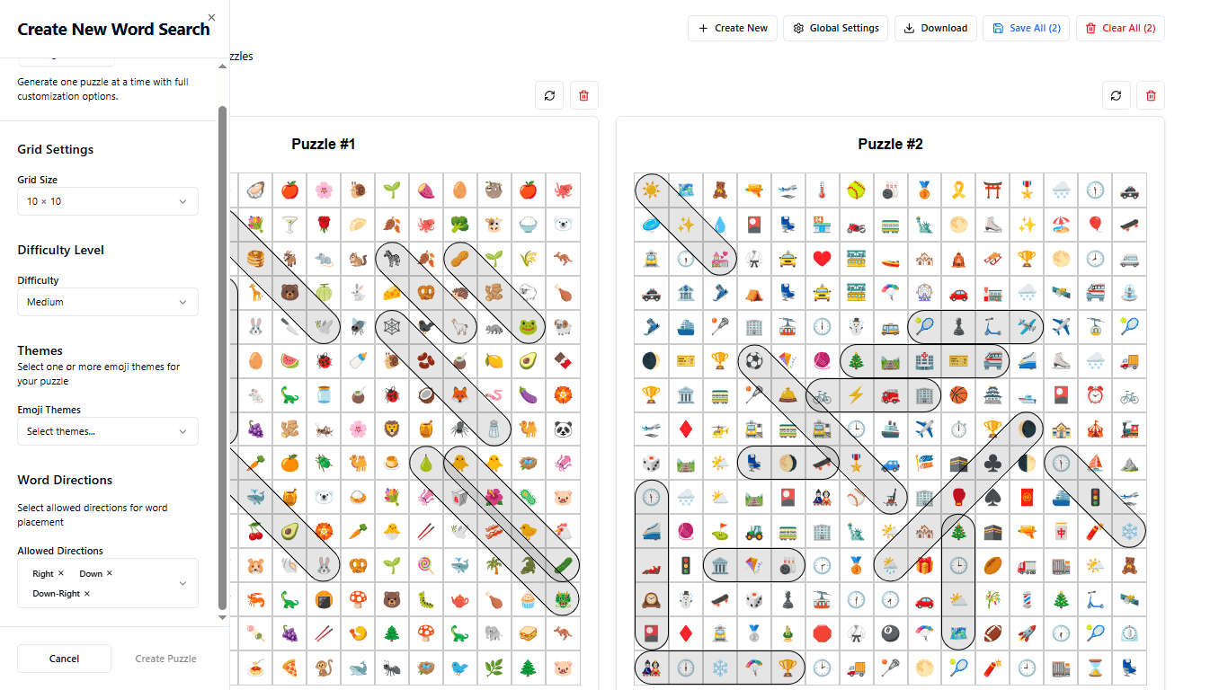 You can adjust grid sizes, choose themes, set difficulty levels, and even regenerate puzzles until you find the perfect design, all in one place.