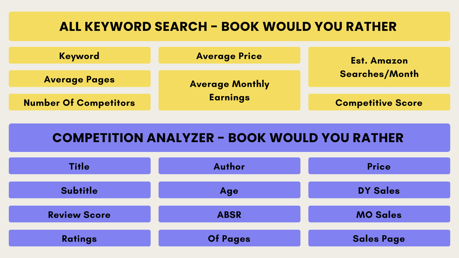 This bonus includes a curated list of 65 high-intent keywords for Would You Rather books, along with a 102 title Would You Rather Competition Analyzer that helps you review and evaluate competing books on Amazon.